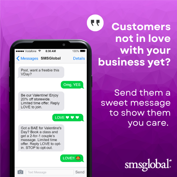 When in Rome, do as what the Romans do. This Valentine’s Day, send Valentine's Day gifts to your customers. Send a special ‘secret admirer’ message to your customers using bulk SMS. A prime example is to use a Valentine’s Day discount, gift with purchase or invitation to an exclusive in-store shopping experience.